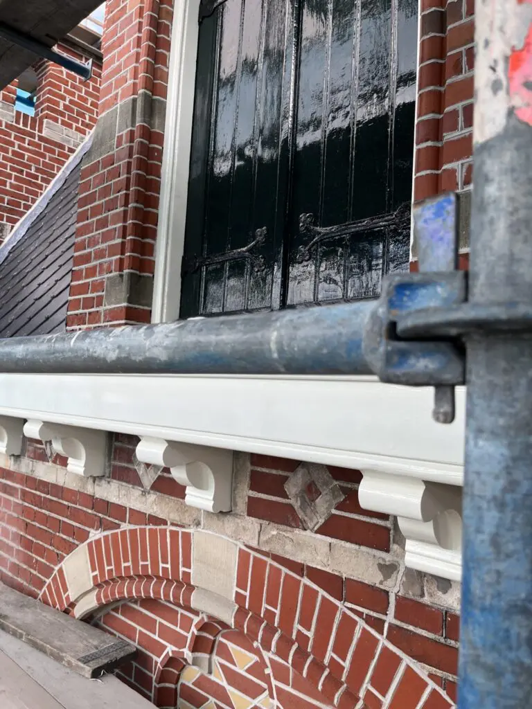 Eveneens op dakniveau zijn de boeien fors in de verf gezet. ‘Met meerdere lagen snelgrond en primer. De boeien stonden open en waren zo droog dat je de eerste twee lagen niet eens terugziet. We hebben er niet aan geplamuurd. Dat breekt er toch weer uit. Alleen de verstekhoeken zijn dichtgezet met elastische kit. Het is wel heel goed hout. Vroeger gebruikten ze veel Amerikaans grenen. Dat is vet hout en als dat goed gewaterd is, rot het praktisch niet’, licht Jack toe.