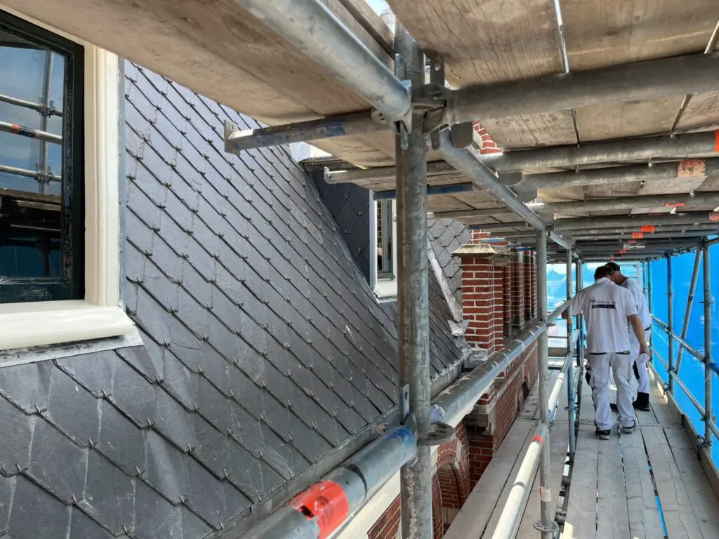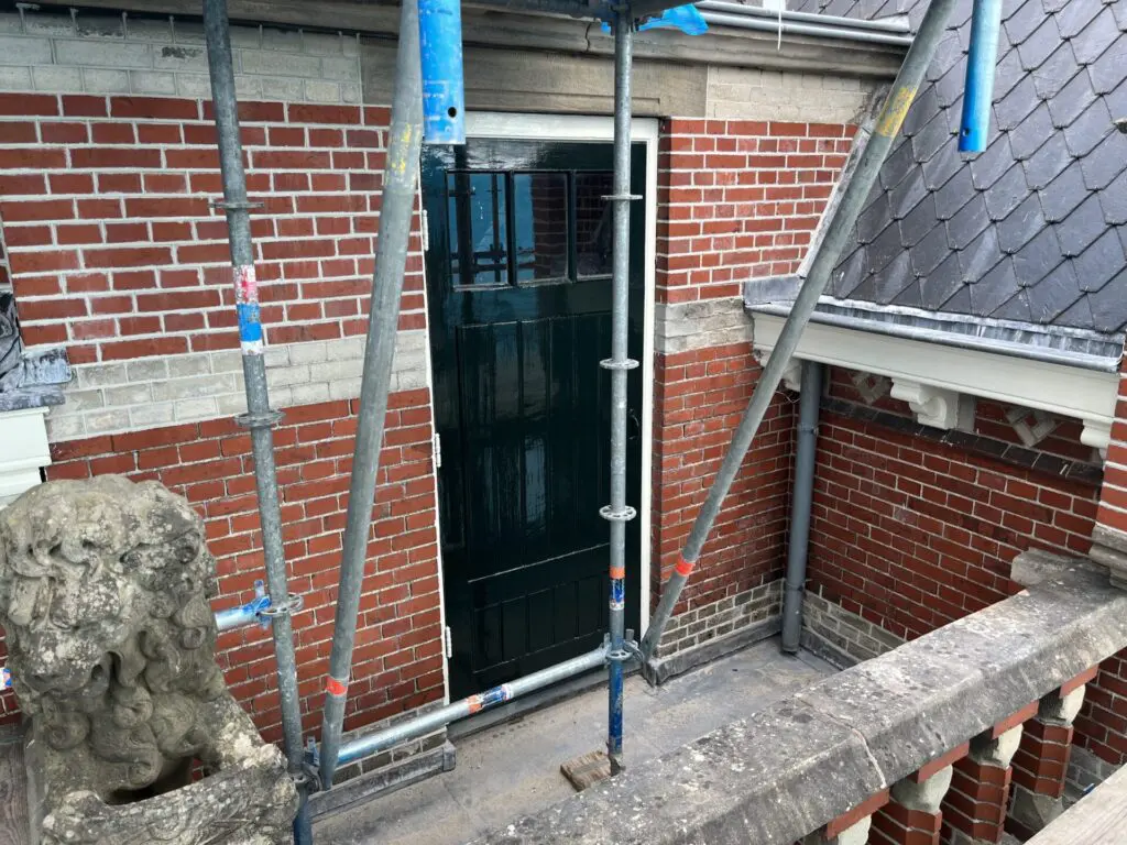 Bij de renovatie zijn diverse partijen betrokken. Silvius Schilders had zelf kozijnen kunnen repareren en vacuümglas kunnen zetten, maar dat is in dit geval uitbesteed aan andere partijen. De steigerbouw is uitgevoerd in opdracht van bouwbegeleider Buro Erfdiel. ‘De bedoeling was dat wij bovenaan zouden beginnen en naar beneden zouden gaan als alle andere partijen weg waren. De praktijk was echter anders. We zijn er zelfs anderhalve week tussenuit geweest. Vooral omdat de monumentale stopverfvervanger tijd nodig had om uit te harden, voordat wij die konden schilderen. Dat aanbrengen werd in twee keer gedaan en ging niet heel snel’, vertelt Paul.