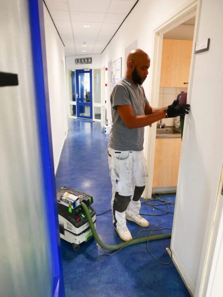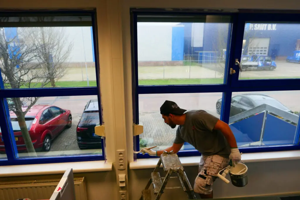 “Dat was hard nodig ook, want er was tien jaar lang niks aan gedaan. Behalve een gedateerde aanblik zie je op de wanden, deuren en kozijnen ook veel handvetten, beschadigingen en vuil terug, waaronder zwarte vingerafdrukken van personeel dat vanuit de werkplaats even naar het kantoorgedeelte komt. Ik fris alles hier nu weer op. Het kantoorpersoneel werkt dan tijdelijk in een andere ruimte”, vertelt hij.