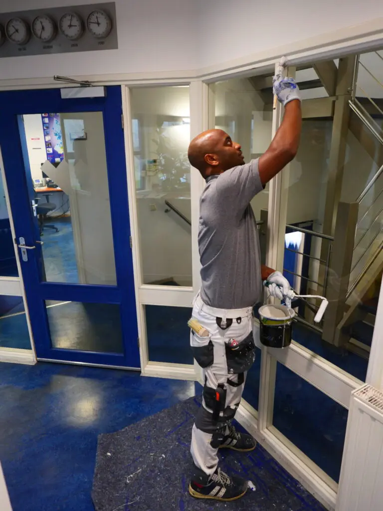 “Hij verdient zijn brood als timmerman en houtsanering is een van zijn specialismen. Ik schakel hem vaak in als ik bij een schilderklus veel houtrot of ander schadewerk tegenkom. Ook hier bij Weatherford springt hij mij bij met onder andere houtschuurwerk.”