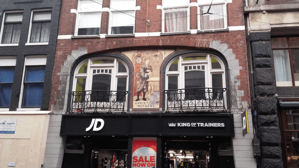 Het tegeltableau, voorstellend de uitvinder van het slingeruurwerk Christiaan Huygens, maakt een integraal onderdeel uit van de uit 1903 daterende gevel.