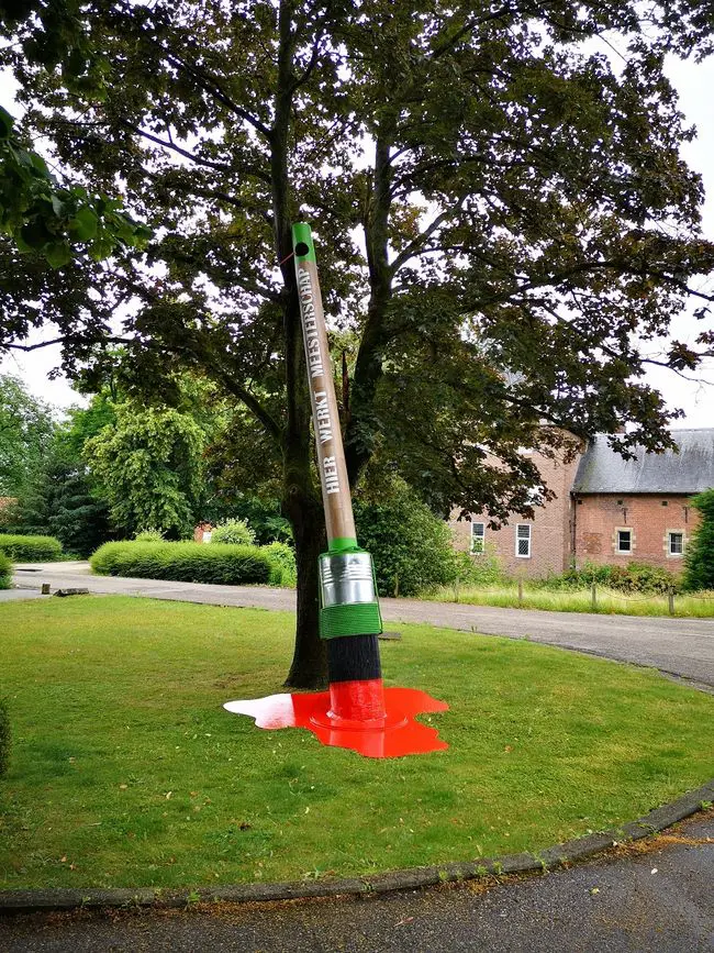 ‘Waarom we gekozen hebben voor een uitvergroting van een verfborstel? De borstel staat voor de handigheid, oog voor detail en afwerking van onze leerlingen. De rode verf staat voor alarm omdat er nood is aan meesterschap maar ook voor passie. Passie voor het vak’, legt zegsvrouw An Beerden uit op de website van Bouwkroniek.