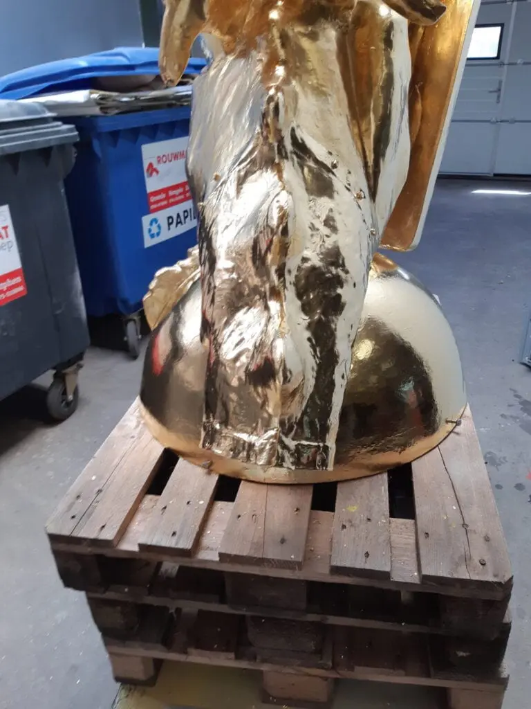De eigenaar van Reinaert Vergulders uit Groenlo heeft de sculptuur schoongemaakt, beschadigingen zoals oxidatie gerepareerd, bijgewerkt met een 2K-primer en vervolgens volledig (over)verguld. ‘Alle opnieuw vergulde onderdelen zijn gepatineerd om kleurverschil met het oude verguldwerk op te heffen.’