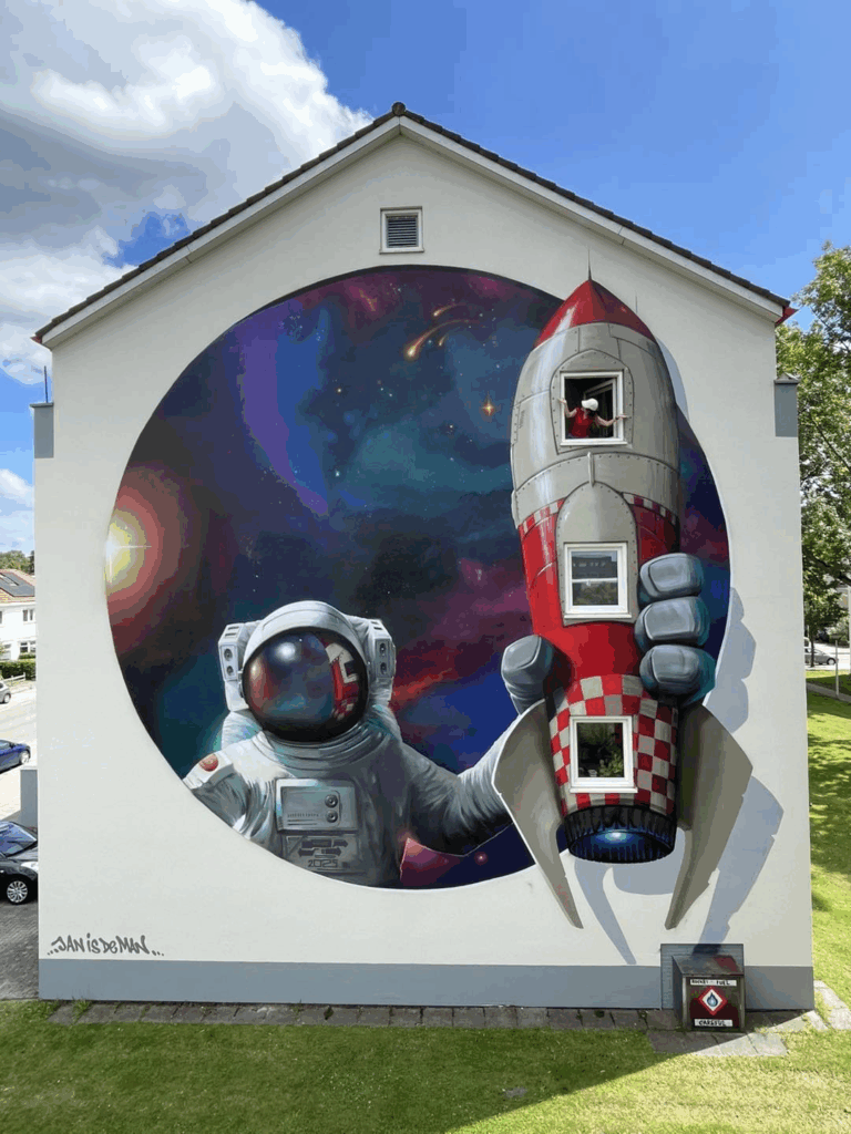De eerste mural, gemaakt door kunstenaar Jan is de Man, is nu dus af en toont een astronaut die, raket in de hand, vanachter een denkbeeldig raam uitkijkt over de straat.