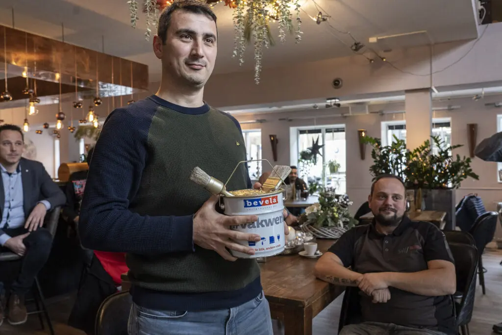De gouden verfemmer met dito kwasten erin was voor Özkan Yazgu. Kajo Kovar van groothandel Bevela maakte de trofee. ‘Ik heb purschuim in een strijkvaatje gedaan, daar twee kwasten in gezet en het geheel goud afgespoten. Zo simpel, net een sinterklaassurprise’, lacht Kovar.