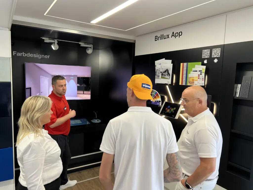 Voor deze gelegenheid was een van de drie showtrucks van Brillux vanuit Duitsland naar Oostzaan gereden. In deze tot showroom omgebouwde vrachtwagen kunnen schilders op locatie altijd de nieuwste producten van de verffabrikant aanschouwen, zo ook nu.