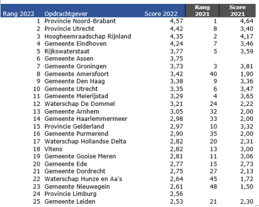 Noord-Brabant kwam elk jaar als nummer één uit de bus en laat deze keer de provincie Utrecht nipt achter zich. Ook de verschillen met de nummers drie en vier – respectievelijk het hoogheemraadschap van Rijnland en de gemeente Eindhoven – zijn miniem. Vijfde werd Rijkswaterstaat.