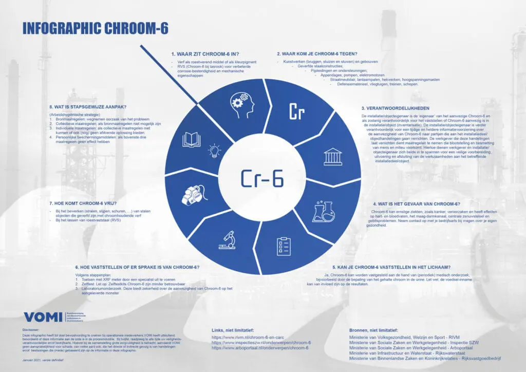 De VOMI, vertegenwoordigt bijvoorbeeld de industriële reinigingsbedrijven, de steigerbouw, de metaalconservering, isolatie, piping & mechanical (leidingwerken), installateurs van elektrische instrumentatie en bedrijven in hijs- en transportwerkzaamheden. Met de infographic, kennissessies en rondetafelgesprekken, wil de VOMI aan bewustwordingm over de giftige stof werken bij opdrachtgevers en opdrachtnemer en hun personeel. Iedereen speelt immers een rol bij het constateren van de aanwezigheid van Chroom-6 en het nemen van maatregelen.