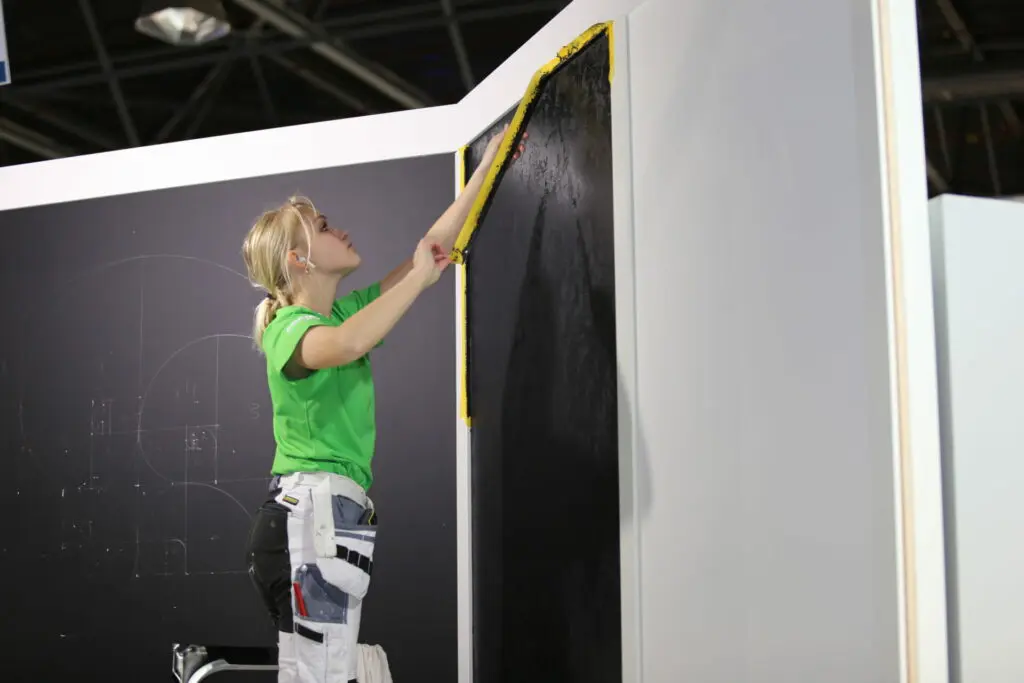 ‘Petje af dat je in zo’n omgeving rustig blijft’, zegt Matthijs Wierts, directeur van de Schildersvakopleiding in Assen. ‘Nee, ik heb geen probleem met stress’, beaamt Amy. ‘Ik vond het supergaaf om in zo’n grote hal aan het werk te zijn. Veel mensen die langskomen, vragen stellen, complimenten geven.’ Moeilijkste onderdeel was de geheime opdracht, waarbij de finalisten een ontwerp op schaal natekenden en inschilderden. Veel rekenwerk. Amy: ‘Het moest tot op de millimeter nauwkeurig kloppen.’