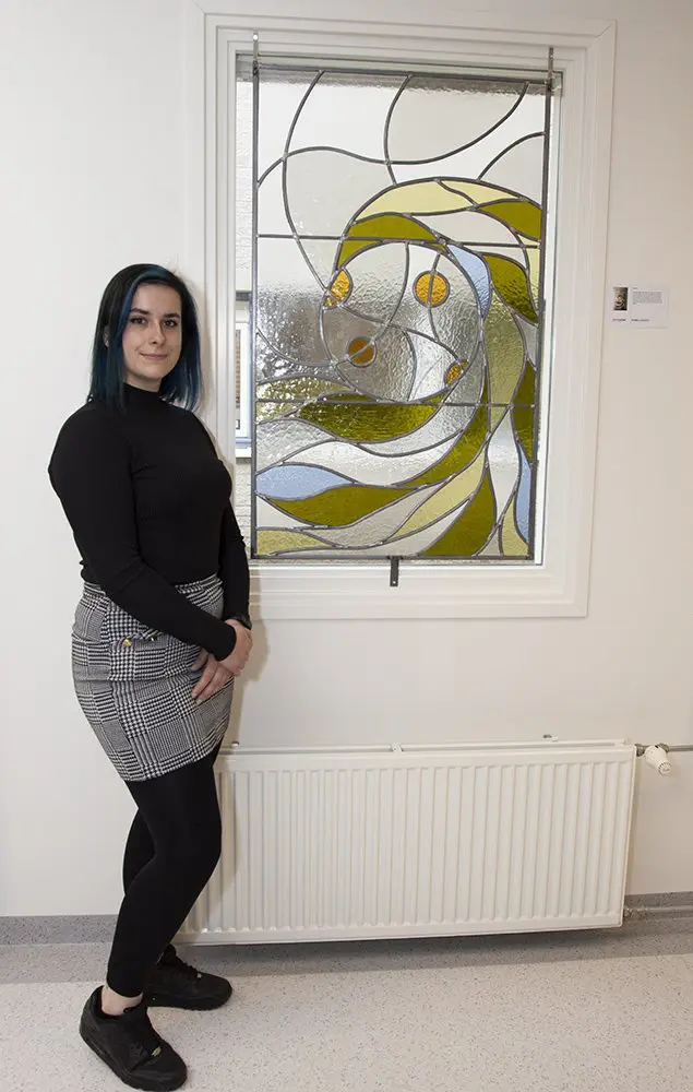 Corona kwam in golven dus dat was voor studente Kyra het uitgangspunt voor haar ontwerp van en glas-in-loodraam. “Door elkaar online te spreken, blijf je met elkaar verbonden. Ook al zit je in je eigen bubbel.” Ze is blij met het eindresultaat. “Het verwijst naar een moeilijke tijd die we hebben meegemaakt. Het is bijzonder dat ons werk nu in het ziekenhuis te zien is.”