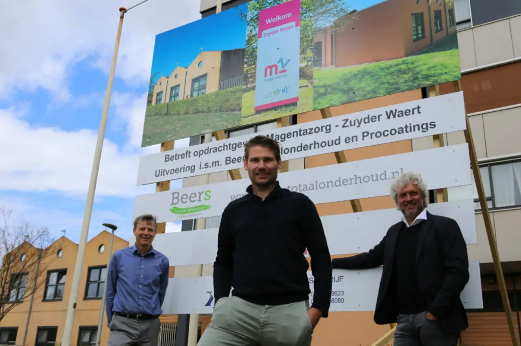 De hoogbouw, de kern van Zuyder Waert, is al zo’n veertig jaar oud en huisvest tevens de Raad van Bestuur en meerdere diensten van Magentazorg. Het woonzorgcomplex is daar ruim twaalf jaar geleden omheen gebouwd. Deze relatief nieuwe gebouwen zijn opgetrokken uit op kleur gegoten betonnen prefabelementen. “De architect koos voor een aparte kleurstelling”, vertelt Beers. “De muren van de huisjes zijn enigszins terra en de gevels van de vleugels hebben een meer gele tint. Alles af fabriek, dus je zag verschillende kleurschakeringen en vlameffecten, maar dat gaf niet. Het mocht juist bont zijn.” Naarmate de jaren verstreken, werd de uitstraling echter minder. “Kleuren vervaagden, de gevels werden viezer, het zag er onverzorgd uit”, aldus Beers. Ook de eenheid ging verloren, daar de kleuren op verschillende ondergronden waren aangebracht: betonsteen, gevelisolatie en onbehandeld metselwerk.