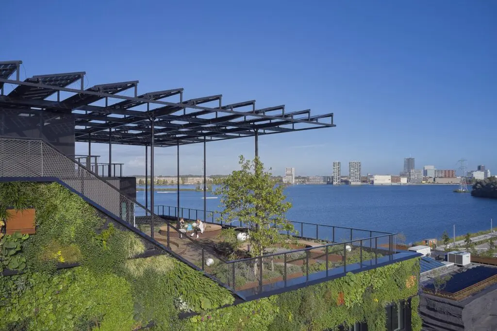 Het levendige natuur- en groendak – dat via een esthetische, brede trap verspringt van de vierde naar de vijfde verdieping – is zowel een aangename verblijfsruimte als een inspirerend leer- en experimenteergebied. Een luifel van semi-transparante pv-panelen beschermt de studenten tegen de zon en creëert, volgens de architect, met haar mooie getemperde licht een fijne sfeer. Het opgevangen regenwater dient als verwarmings- en koelingsbuffer en voorziet in de bewatering van het groen.