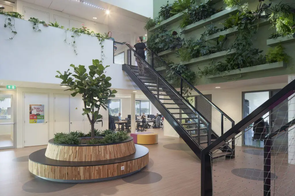 Daarnaast zijn er allerlei biodiversiteit bevorderende maatregelen geïmplementeerd. Denk aan kruiden, boomstronken, een takkenrail en vele andere nestmogelijkheden voor insecten, vogels en vleermuizen. Zelfs de verlichting is diervriendelijk. Deze stadsnatuur prikkelt niet alleen de zintuigen, maar heeft ook een educatieve waarde en draagt, volgens BDG Architecten, verder bij aan betere leer- en werkprestaties.