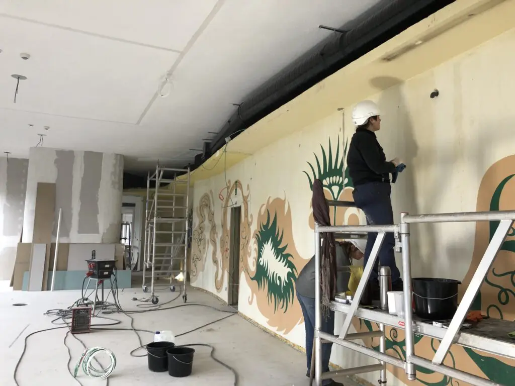 Fabian Rasson ging – samen met een team van tien medewerkers – in het zogenoemde Braemgebouw van de VU aan de slag. Twintig jaar eerder zag hij deze murals voor het eerst, als student aan de universiteit. “Mijn vriendin Elsbeth Denys en ik deden er een master Cultuurwetenschappen. Onze toenmalige professor, Jeanine Lambrecht, was heel erg begaan met het Braemgebouw en de muurschilderingen. Onder haar invloed hebben we er een diepgaand onderzoek aan gekoppeld. Later zijn we ons eigen bedrijf begonnen en hebben we ons kandidaat gesteld om die bewuste muurschilderingen te restaureren en dat is nu dus gelukt”, vertelt hij.