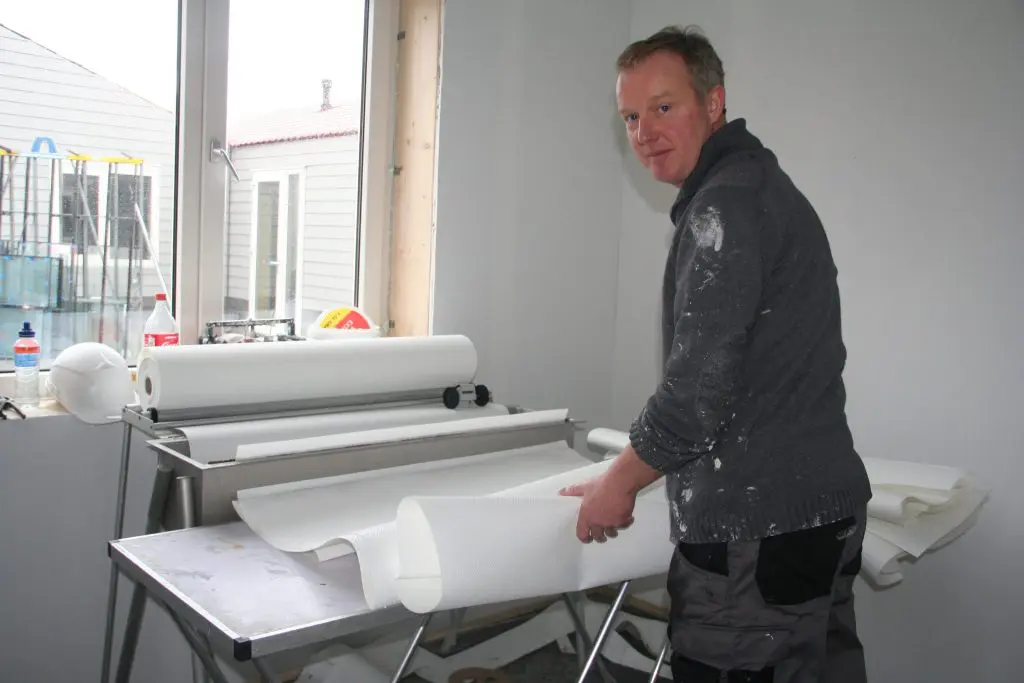 “Als behang brengen we voorbehandelde Meesterhand Glasvlies aan, dat we eerst door de waterbak halen. Dat wordt vervolgens afgewerkt met één laag hoogdekkende, matte Zenit PU 10-verf. Daarmee heb ik een bewuste keus gemaakt voor een goede en vooral ook betaalbare kwaliteitsverf van Herbol. Het betreft een schrobklasse I-product, dus ook prima reinigbaar.”