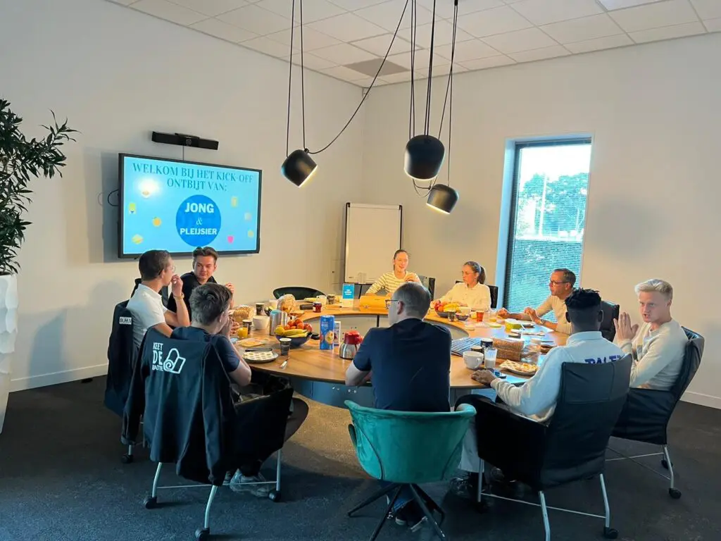 De kick-off vorig jaar van Jong & Pleijsier in de vergaderzaal van Palet Vastgoedonderhoud en Pleijsier Bouw en Onderhoud