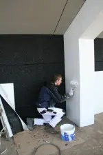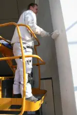 Ook het exterieur van DolfijndoMijn kreeg een opfrisbeurt. Plaatselijk schildersbedrijf bracht op het betonwerk frisse kleuren aan. “Het beton droeg de sporen van meer dan veertig jaar blootstelling aan weer en wind”, zegt directeur Henk Visser. “Eerst hebben we de ondergrond onder hogedruk schoongespoten, daarna is het watergedragen voorstrijkmiddel Sigmafix Universal aangebracht. Dat is allemaal net voor de kerstdagen uitgevoerd. In het voorjaar zijn we begonnen met de afwerking: twee lagen Sigmatex Superlatex, een matte schrobbare watergedragen muurverf.“ Visser zegt dat zijn schilders bij de uitvoering redelijk veel last hadden van de winterse kou, die tot in april duurde. “Als de temperatuur te laag was, konden zij gelukkig elders in het Dolfinarium wel weer aan de slag.” De firma Vreeken voerde er namelijk ook schilderwerk uit in restaurant De Dageraad, het Roggenrif en het Zeeleeuwentheater. “Ook in het koepelgebouw zelf hebben we nog een ruimte geschilderd. Al met al zijn we van september tot en met april in het Dolfinarium bezig geweest. Voor ons was het een mooi en veelzijdig project.”