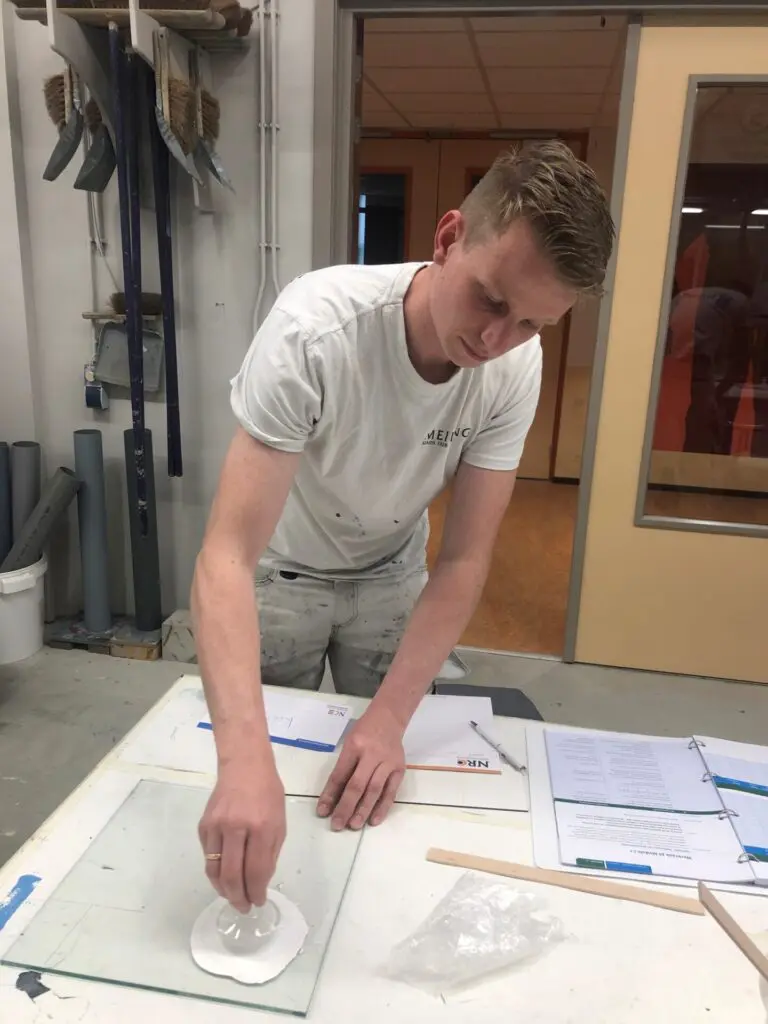 Student Koen Natzijl, werkzaam als restauratieschilder bij Meiling Meesterschilders in Putten, vertelt over het blok verftechnologie: “De theorie wordt klassikaal behandeld. Er is hierbij gelegenheid om vragen te stellen voor extra toelichting.”