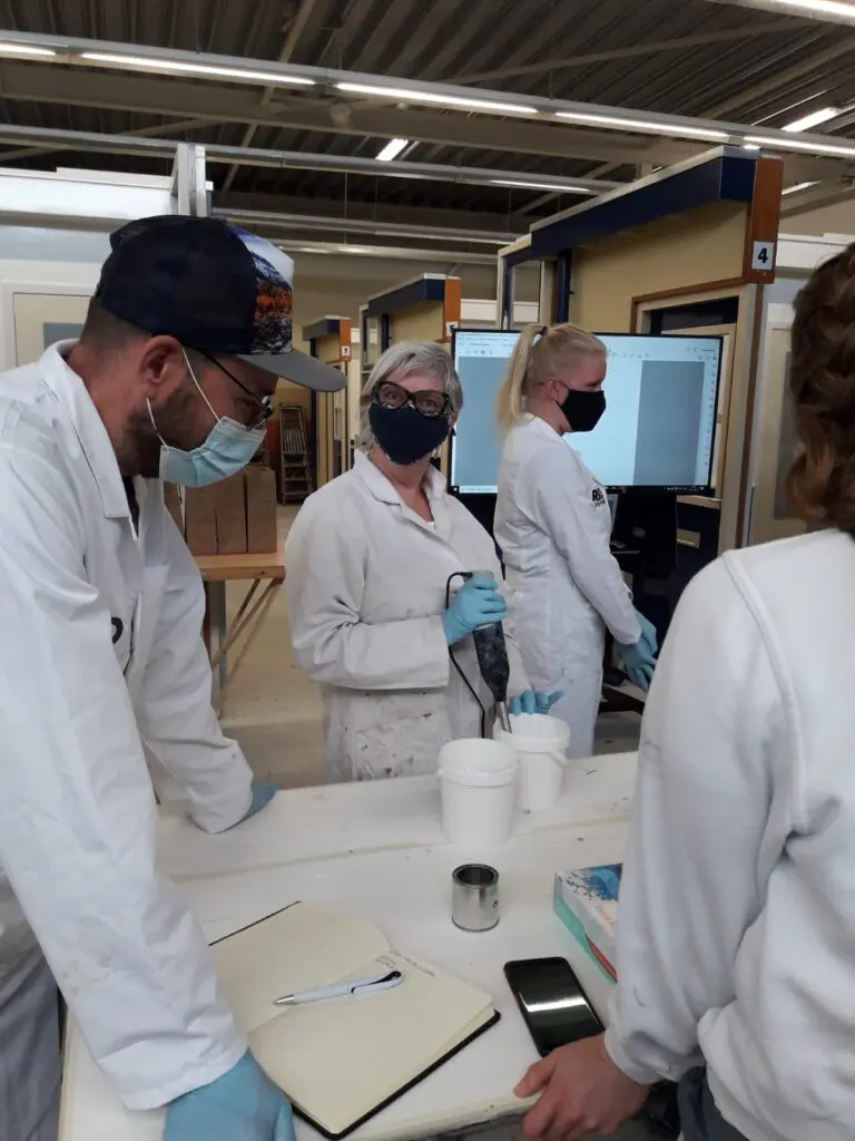 Tijdens het blok over verftechnologie heeft Linova Verf & Bladgoudgroothandel uit Zutphen in samenwerking met verffabrikant Rigo uit IJmuiden een studiemiddag verzorgd over ambachtelijke verfsoorten.
