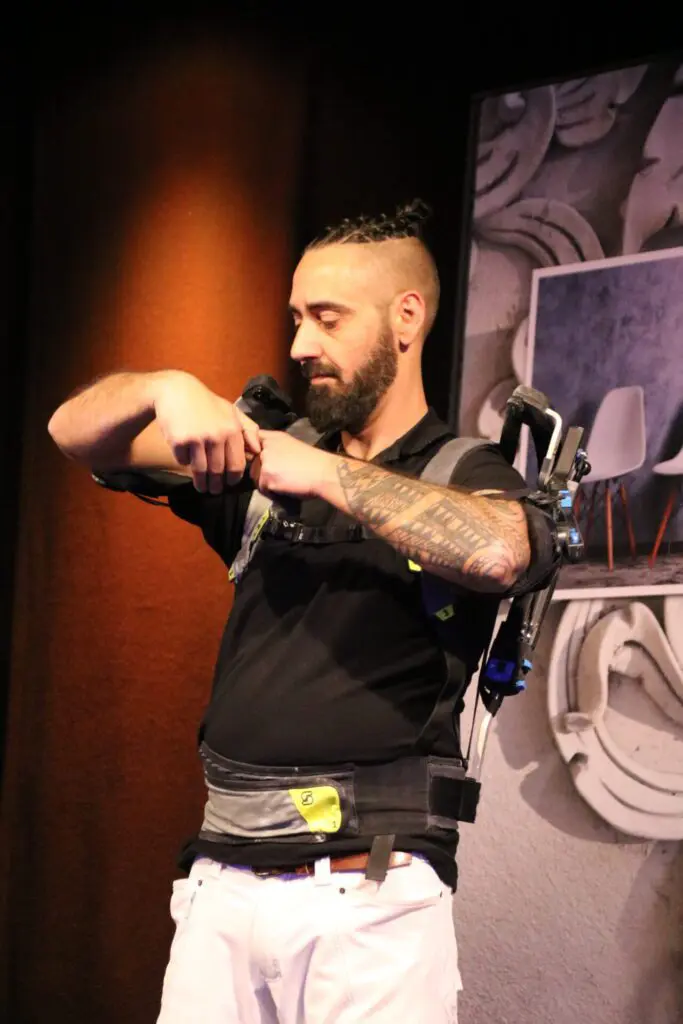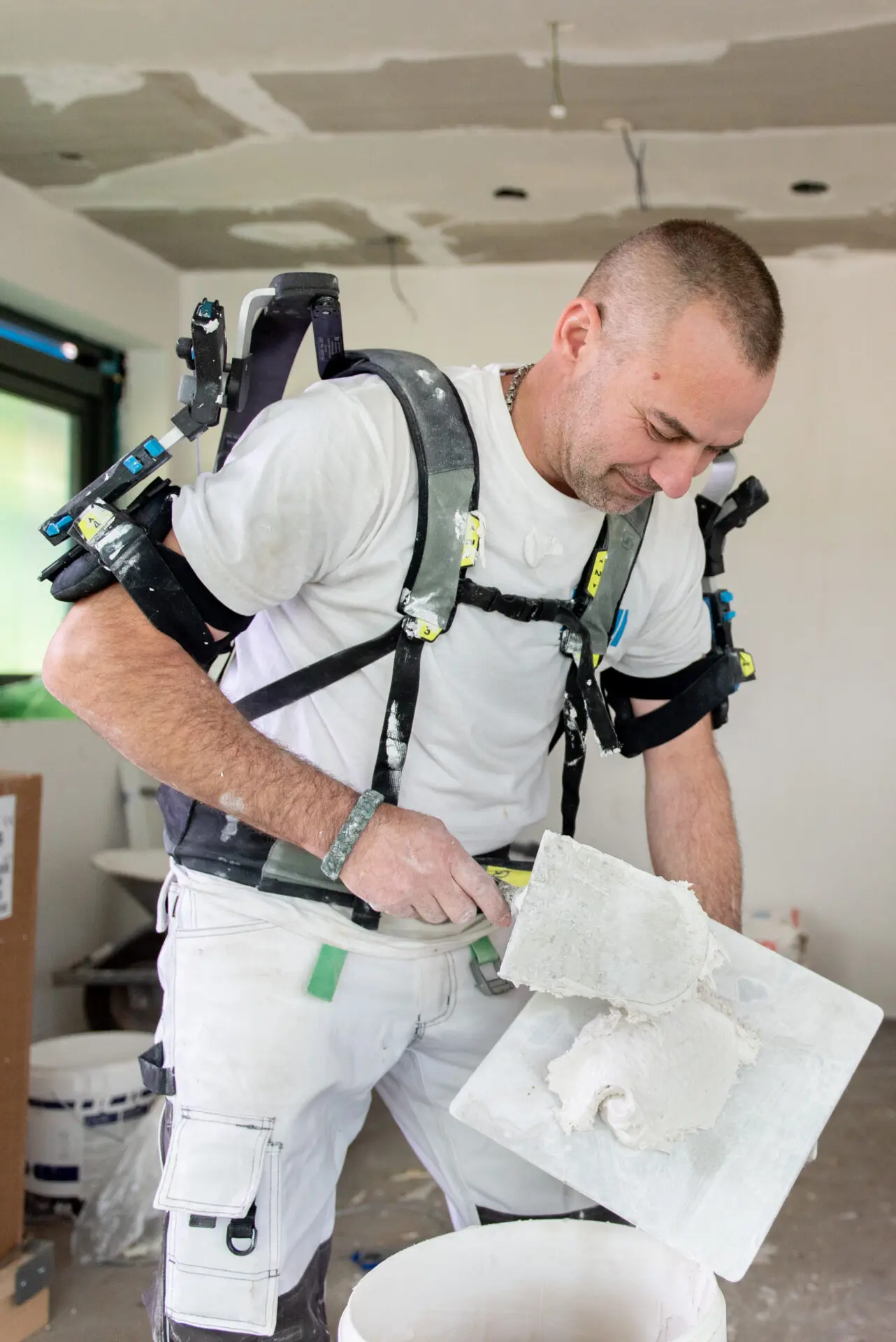‘Ik ga ze dan zeker voor mijn medewerkers aanschaffen’, zegt Giovanni Succu. De relatief jonge en krachtig ogende stukadoor is helemaal overtuigd: ‘Je merkt dat het je helpt, dat het je spieren ontlast in je armen, je schouders en je nek, vooral als je boven je hoofd moet werken. Ik heb op dit moment helemaal geen lichamelijke klachten, maar ik wil dat ook graag zo houden. Stukadoren is heel leuk, maar ook heel zwaar werk. Ik wil het graag lang blijven doen.’