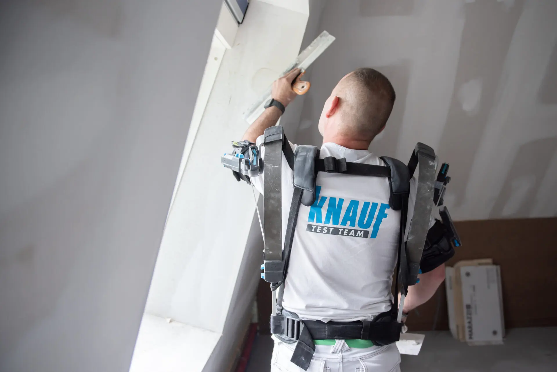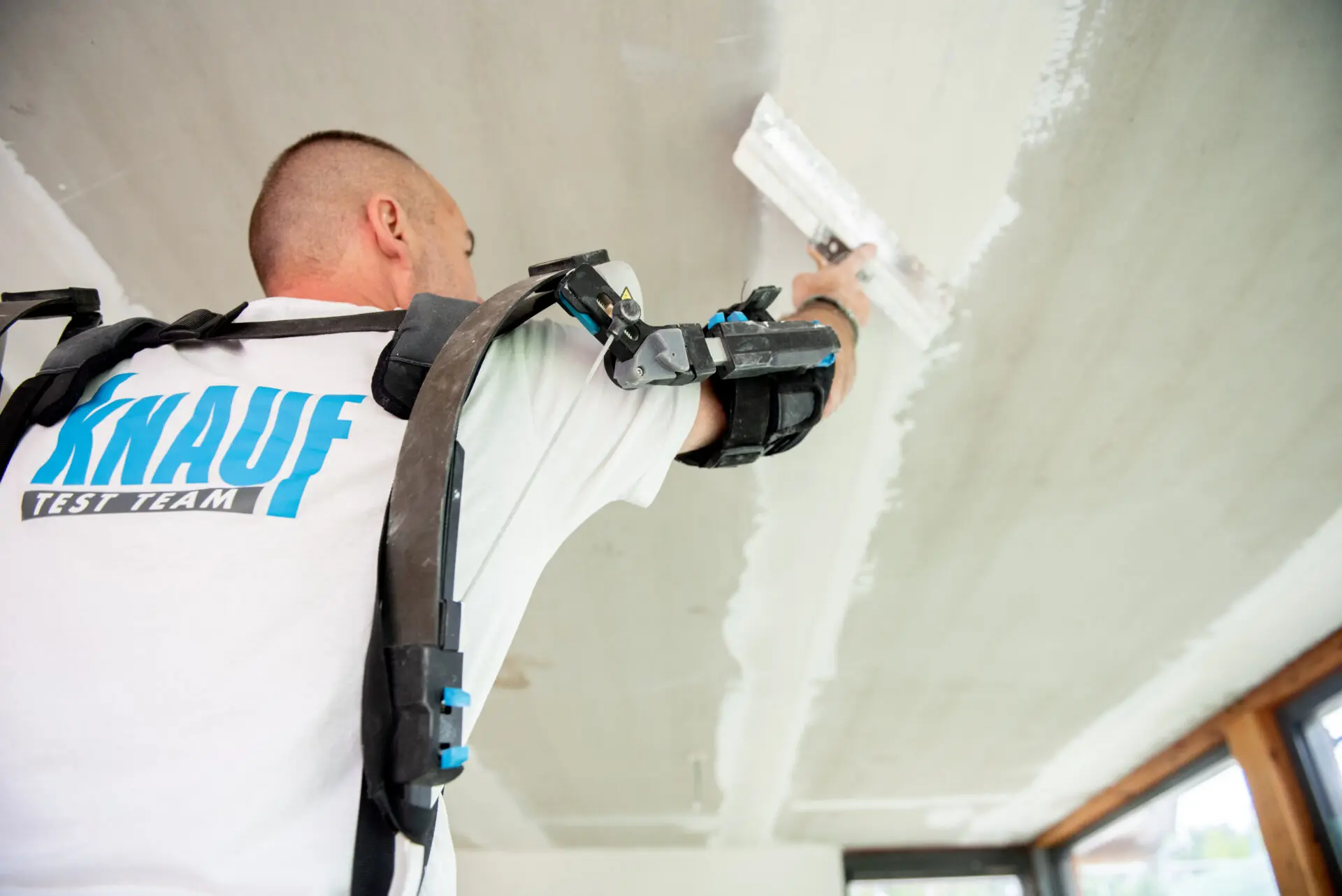Rob van Groningen, managing director bij Knauf Nederland: ‘Eigenlijk zit het verlichten van werkzaamheden van stukadoors al sinds ons bestaan in onze genen. Zelfs ons basisproduct, gips, was in de vijftiger jaren al een vooruitgang: stukadoors maakten in die tijd hun gips zelf, een zwaar en langdurig proces. Daar waren onze kant-en-klare producten een oplossing voor. Later zijn we ons gaan bezighouden met de applicatie, spackspuitmachines gaan ontwikkelen en verkopen, ook dat maakte het werken lichter. Nu zijn we bij de persoon zelf aangekomen en hoe we diens inspanning kunnen verminderen.’