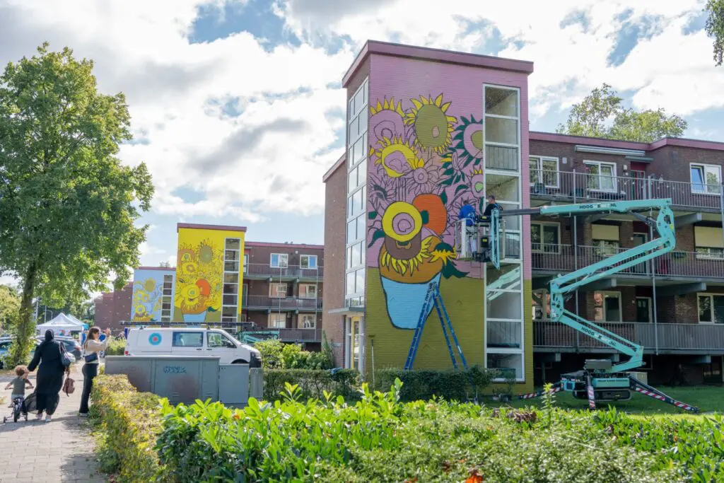 Het drieluik voor de gevels is ontworpen door de Belgische kunstenaar Lieven Seys, tevens senior marketing manager bij Sigma Coatings. Hij koos voor iedere muurschildering een andere kleur als achtergrond: ochtendblauw, middaggeel en avondrood. Seys, een groot liefhebber van Van Gogh, vertelt dat achter de Zonnebloemen van de kunstenaar een grote symboliek schuilgaat. ‘Zonnebloemen staan voor verbinding, dank en trots. Thema’s die goed passen bij Sigma Coatings. We willen naast de schilder staan en zijn dankbaar en trots dat zij met onze verf Nederland elke dag weer een beetje mooier maken. Eind van de dag toosten we samen met de bewoners van de flats op het eindresultaat. Ook op die manier brengen we met deze gevelschilderingen verbinding tot stand.’