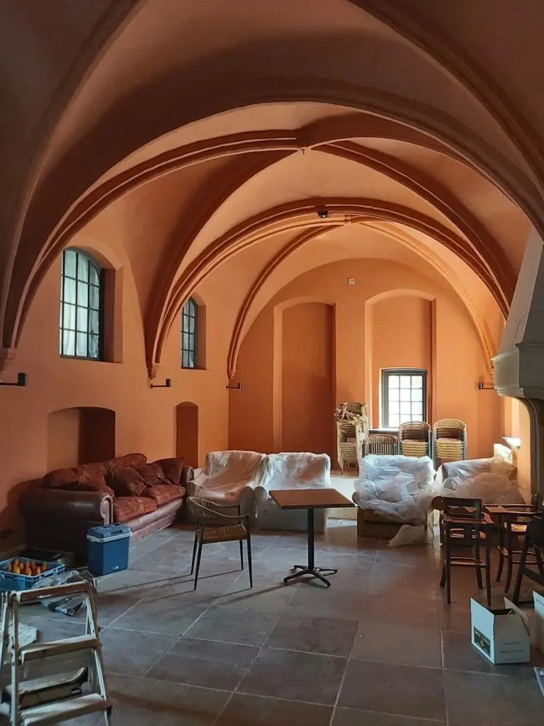 Dus geen perfect besnijwerk, niet afplakken van beglazing of inwendige hoeken om twee kleuren tegen elkaar af te zetten. Verf aanbrengen d.m.v. kwasten en blokwitters, kwaststrepen laten zien. Zoveel mogelijk de technieken toepassen om een resultaat te krijgen zoals dat in de tijd van de monniken gedaan werd. Met die visie heeft de opdrachtgever zich door alle partijen laten adviseren en de keuzes gemaakt om tot een perfect resultaat te komen. Voor ons als schildersbedrijf betekent dit dat alle facetten van het mooie vak voorbij kwamen, en al onze kennis, vaardigheden en passie hierin gestopt gaan werden.