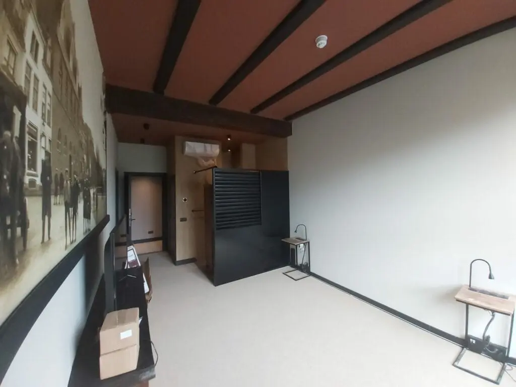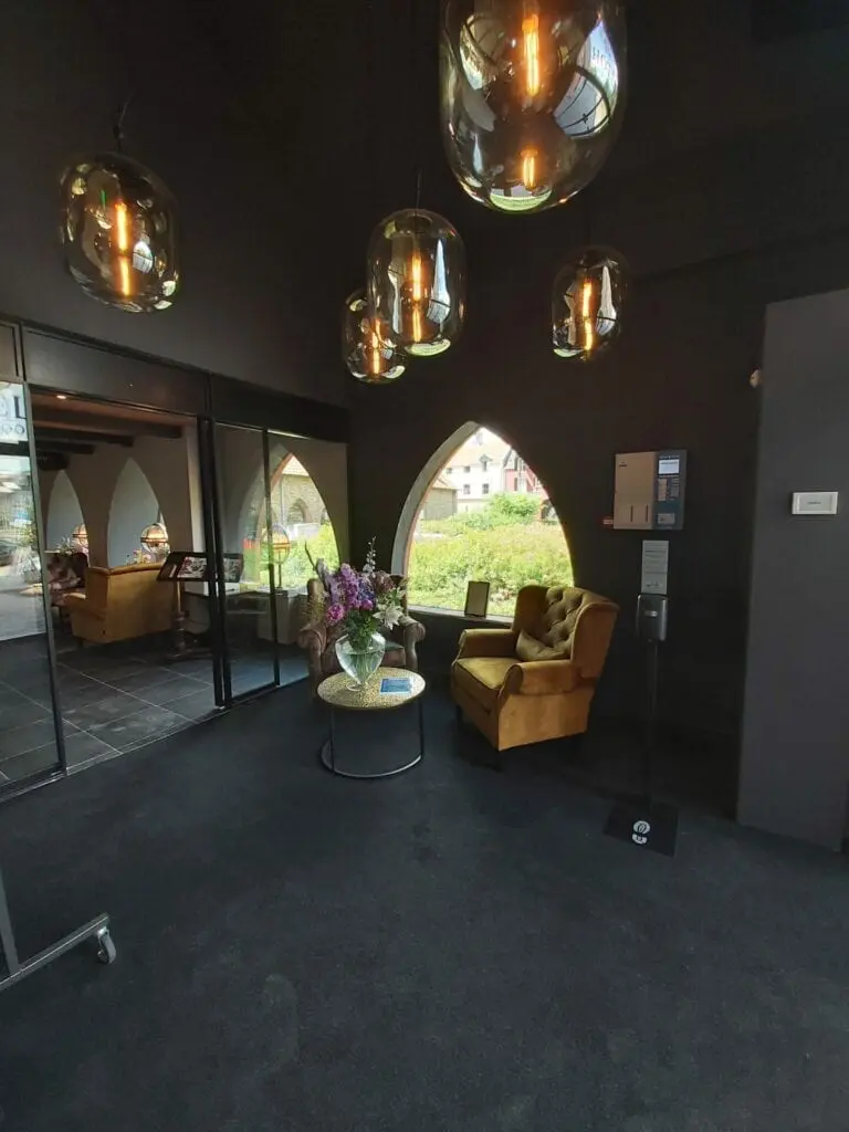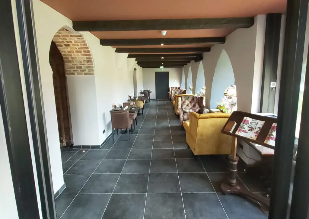 In totaal zijn bijna 500 ruiten ingemeten, enkelbladig glas met een isolerende coating zelfstandig gesneden en geplaatst. Het buitenschilderwerk is uitgevoerd in een gewijzigde kleurstelling. De gevels hadden een licht rode kleur en deze is gewijzigd in een sprekender pompejaans rood. Het lijstwerk en kozijnen zijn uitgevoerd in een zandsteengeel. Ramen en deuren zijn gewijzigd naar Leigrijs Ral 7015. Voor het binnenschilderwerk zijn gelijke kleuren gebruikt. Dit om de eentonige en serene sfeer van de monniken in een klooster te benaderen. Voor de sanitaire ruimtes, zowel de toiletten in de gewelven kelder als de toiletten en doucheruimtes aan de hotelkamers, is gebruikgemaakt van een stuctechniek die waterproof is. De wanden zijn in een okergele aardetint afgewerkt met Coprox stuc. Dit is een grove waterdichte stucafwerking met een leemachtig resultaat. Dit is door onze eigen mensen aangebracht. Tevens is op diverse plaatsen in zowel het restaurant en kloostergang als de hotelkamers een fotobehang aangebracht. Hierop is het pand te zien begin 20e eeuw. Ook zijn er een aantal wanden geplakt met een fotobehang met een knipoog naar de verbouwing.