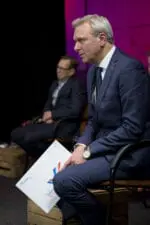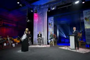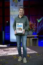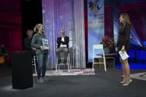 Hans Luiken bij de uitreiking van de Nationale SchildersVakprijs 2020, geflankeerd door presentatrice Annemarie Brüning