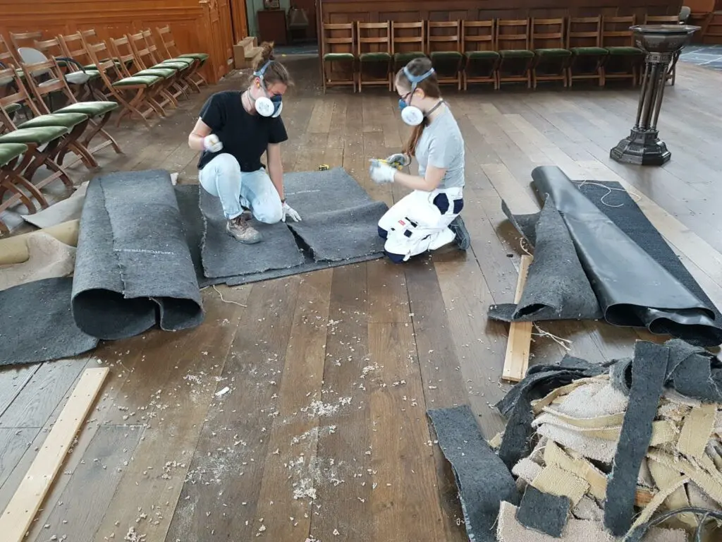In de Noorderkerk, gelegen in hartje centrum, komt dit neer op onderhoud, ontvetten, het gronden en opvullen van kale plekken en waar nodig een nieuwe basisverflaag aanbrengen. ‘De reconstructie wordt direct op de huidige uitvoering aangebracht die hierdoor als ondergrondkleur dient. Wij maken met pigmenten, dierlijke lijm en Arabische gom onze eigen lijmverf. Hiermee brengen we de eikenhoutimitatie aan, die we tweemaal vernissen. Ook plegen we onderhoud aan de echte eikenhouten kerkbanken die samen een oppervlak hebben van 330 vierkante meter.’