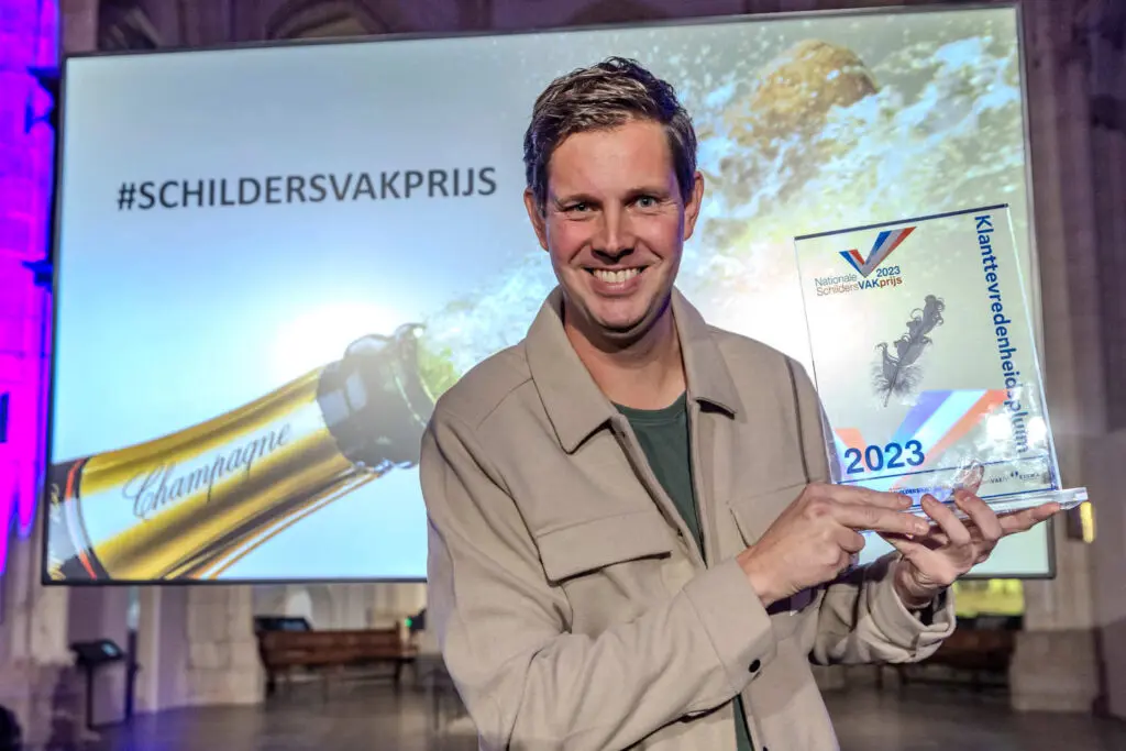 Coenraad Bot uit Huisduinen bij Den Helder ging ervandoor met de Klanttevredenheidspluim. Voor hem de tweede keer, nadat hij deze trofee – voor de meest tevreden opdrachtgever – in 2020 ook al in ontvangst nam. Destijds via een stream, want midden in de coronapandemie. ‘Ik zat alleen thuis in mijn kantoortje. Een heel andere beleving dan nu. Dat ik de prijs vanavond live in ontvangst mocht nemen, maakt het wel extra leuk. Ik zie het als erkenning dat mijn vrouw Inge en ik goed bezig zijn. Uiteindelijk runnen we het schildersbedrijf samen.’ Toch was Bot ook een klein beetje teleurgesteld. ‘Omdat mijn project het niet tot de drie genomineerden heeft geschopt in de categorie Onderhoudsschilderwerk. Ik zat wel in de voorselectie.’