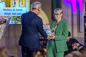 Debbie Poll was namens Wolters de projectleider op Paleis Het Loo, waar het bedrijf onder leiding van superspecialist Ferrie Ovink de ene paleiskamer na de andere opkalefaterde. Totaalschilder-, restauratie- en decoratiewerk, met een keur aan imitatietechnieken, op topniveau. Poll, met haar collega’s uitgebreid toegejuicht op het podium, was er toch een beetje beduusd van. ‘Superspannend om daar te zitten. We hebben vaker meegedaan aan deze prijs én gewonnen, maar toen stond er iemand anders (Hans Wolters, red.) van ons op het podium.’