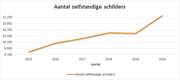 Volgens gegevens van de Rabobank – voor het laatst bijgewerkt vorig jaar winter – bestaat de Nederlandse schildersbranche ‘voor 82 procent uit zzp’ers en sinds 2015 uit ongeveer 12.900 bedrijven’. Het Centraal Bureau voor de Statistiek becijferde dit jaar nog dat het aantal zelfstandig schilders groeit. Net als het aantal zelfstandigen in overige takken van de bouw (selecteer links onder Bedrijfstakken/branches ‘F Bouwnijverheid’).