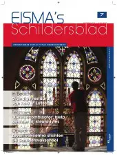 Een medewerker van schildersbedrijf Joosten voert schilderwerk uit bij een glas-in-loodraam in de Heilige Maria Geboortekerk te Losser. Dit godshuis ondergaat een grondige restauratie (vanaf pag. 4).