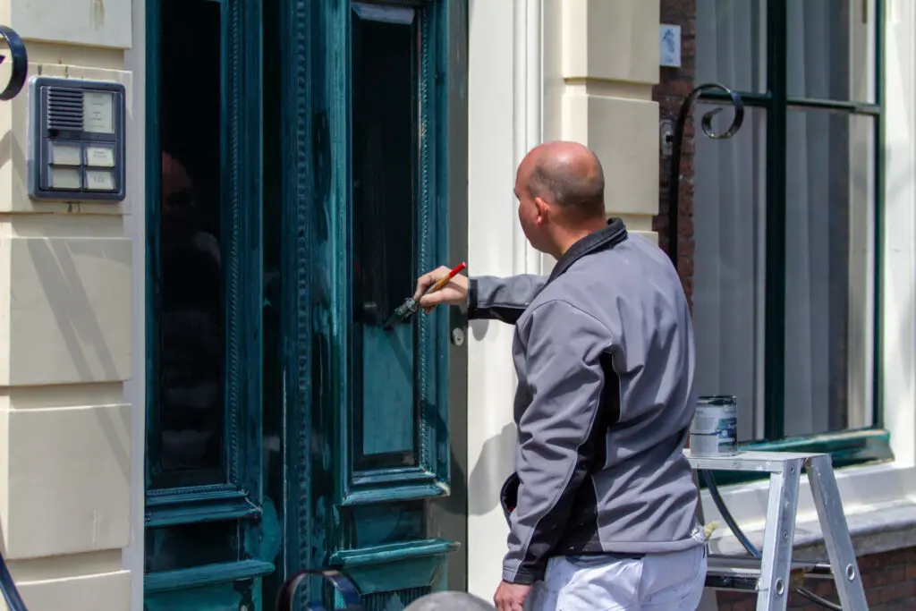 Koeverma werkt bij dit pand met Devetaal Supreme, een serie grond- en aflakken voor buitenschilderwerk die begin 2019 geïntroduceerd werd door Drost Coatings. De lak kenmerkt zich door een verbeterde UV-bestendigheid, glansbehoud en vloei en een goede doordroging, al vanaf het vriespunt. “Dat betekent dat je seizoen veel langer is. Deuren en ramen kunnen sneller dicht, toch ook een pluspunt in de wintertijd. Daarbij wordt de verf minder lang blootgesteld aan viezigheid die erin waait. Bovendien slaat het niet mat.”